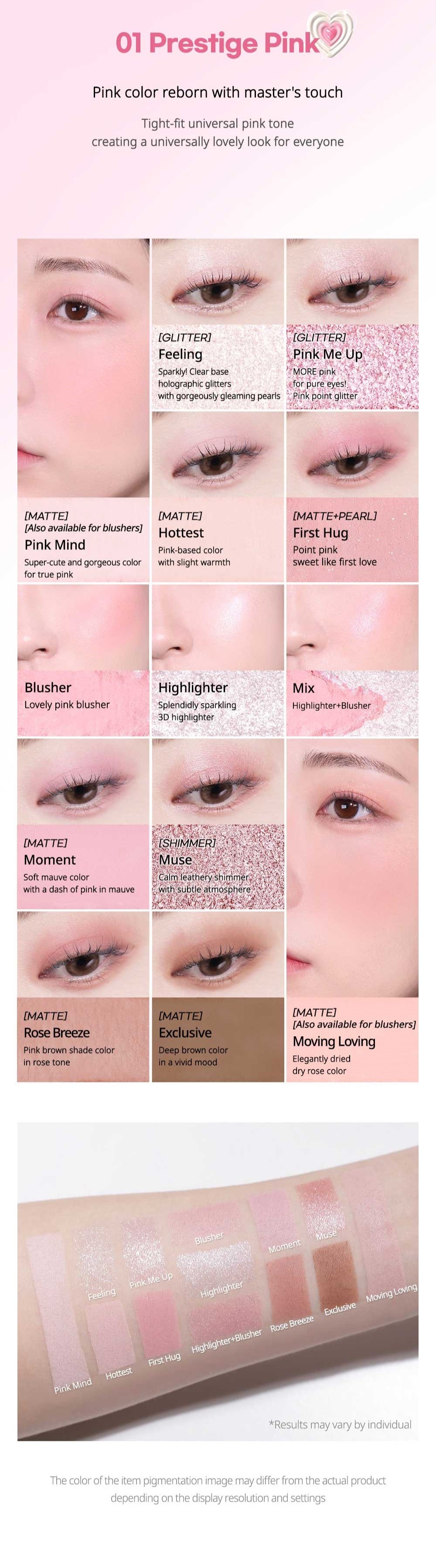 Con texturas matte que se sienten suaves como la seda y se aplican fácilmente en la piel, texturas glitter como luz reflectiva para brillar y texturas suaves como rubor que no se caen fácilmente.